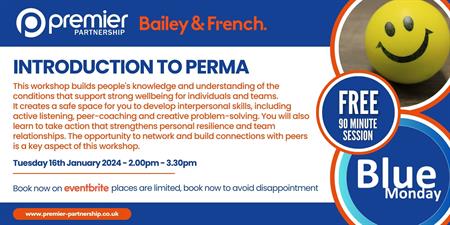 Premier Partnership, in association with Bailey and French, pioneers of a broad range of innovative people solutions for the whole employee experience, are offering a complimentary session titled "An Introduction to PERMA.” This unique workshop is designed to elevate understanding and fortify the conditions essential for robust individual and team wellbeing.